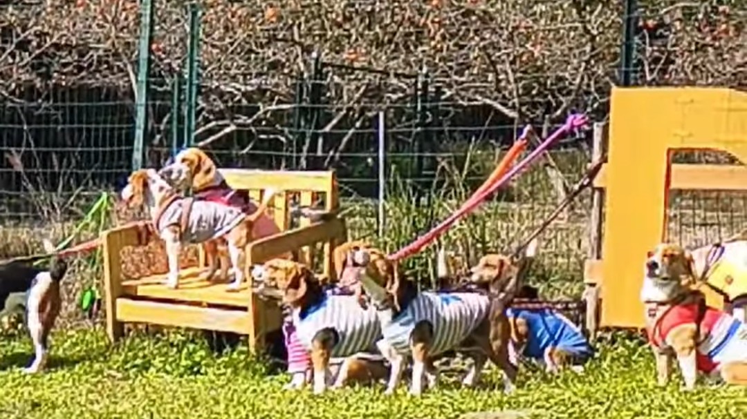 晴天に恵まれ、みかん山にビーグルたちのにぎやかな